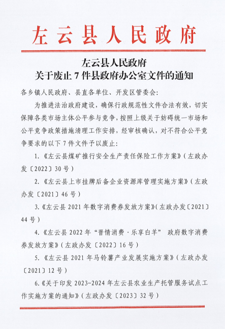 左云縣人民政府關于廢止7件縣政府辦公室文件的通知