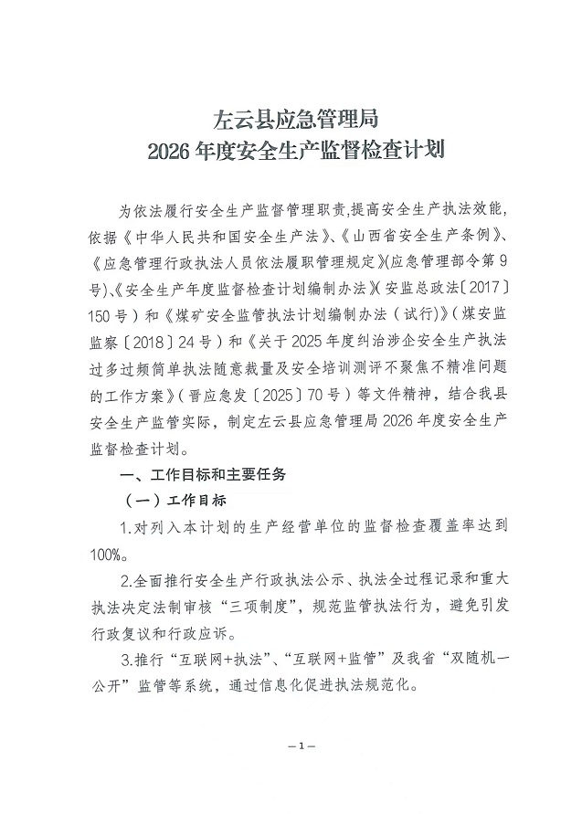 關于印發(fā)《左云縣應急管理局2026年度安全生產監(jiān)督檢查計劃》的通知
